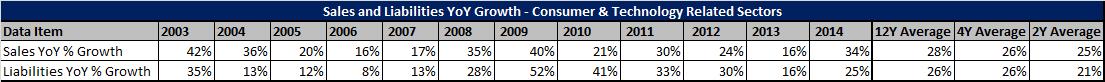 Second, Chinese companies in aggregate have a lot of debt and a good chunk of that debt is denominated in US dollars. Estimates for the amount of US dollar denominated debt vary, but one prominent firm just put the number in the $1.1tn range. A massive devaluation would make that debt harder to repay and would decimate industrial/cyclical companies who have piled on the leverage over the last few years at a far faster rate than consumer, health care, or technology related companies. In an ironic way, the very sectors that would benefit the most by a devaluation from an income statement perspective are the same ones that would be hurt the most from a balance sheet perspective. To help illustrate this, the next two tables show the aggregate annual sales growth of CSI 300 companies broken out into industrial/investment/energy related companies and consumer/tech related companies. In the first table showing the industrial/investment/energy related companies we can see that the liabilities have continued to pile on even as the rate of sales growth has slowed, implying a lot of leverage buildup. In the second table showing the consumer/tech related companies, we see that liabilities and sales have grown in lock step over the last decade, implying not much leverage buildup.