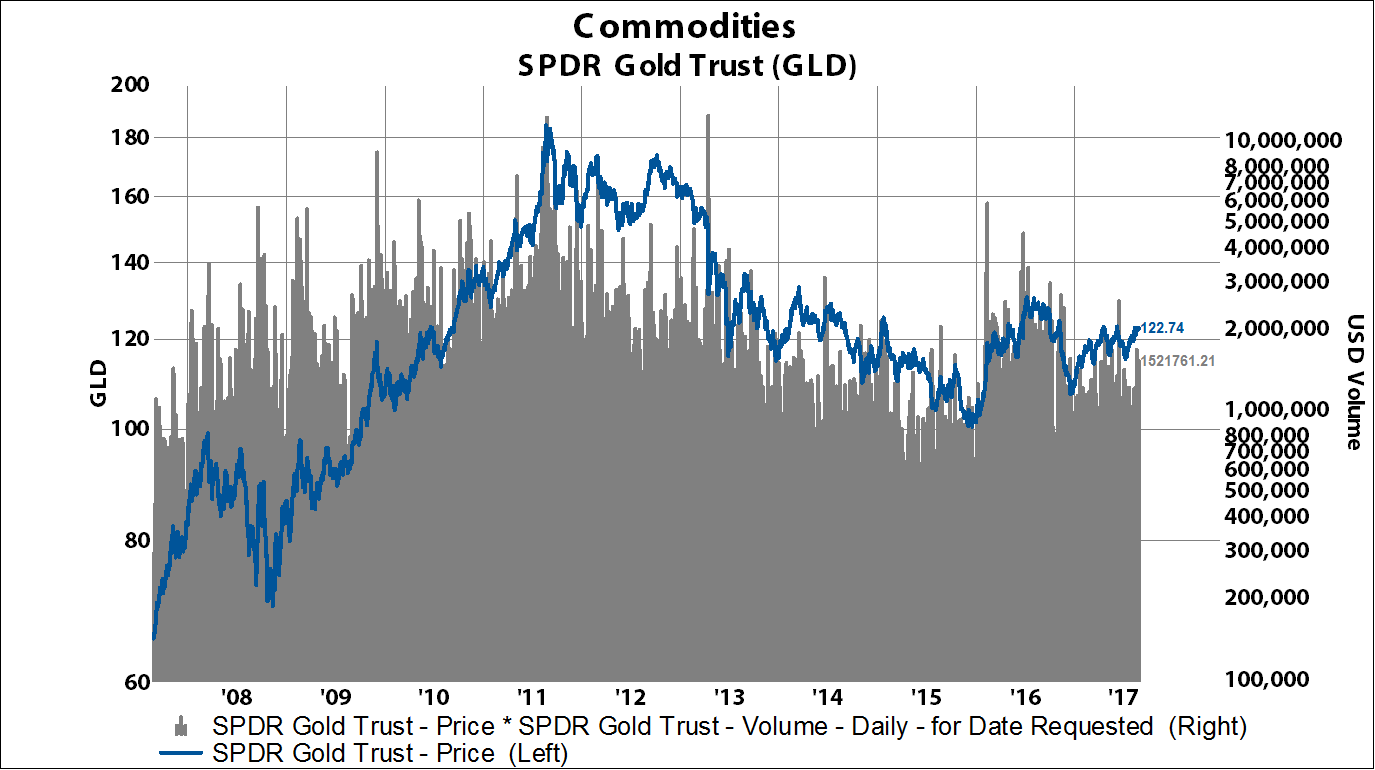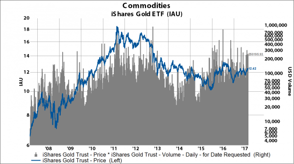August 29, 2017For retail investors, there are a few vehicles for exposure to gold. The SPDR Gold ETF (GLD) and the iShares Gold ETF (IAU) are the biggest, lowest cost funds for retail investors. Below are charts of the GLD and the IAU, with price and USD volume overlay to illustrate the liquidity. The GLD ETF trades about $1.5 billion per day currently, while the IAU ETF trades about $250 million per day.