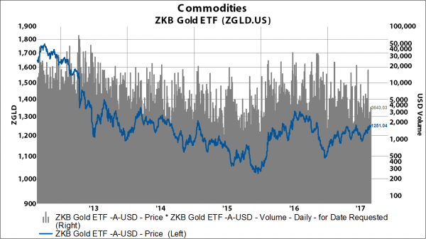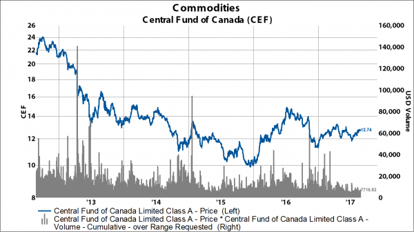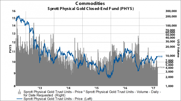There are at least three gold funds that are popular for registered investment companies looking to gain exposure to gold: 1) Central Fund of Canada (CEF), 2) Sprott Physical Gold ETF (PHYS), and 3) ZKB Gold ETF (ZGLD.US). Assets under management and volumes are noticeably lower, but their fees are similar to the GLD.