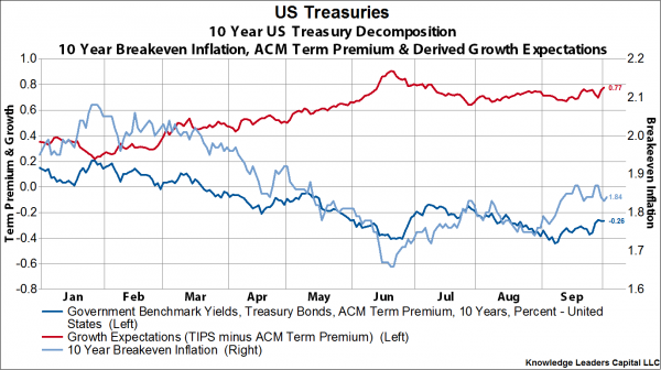 Taking this logic one step further, we can actually decompose a US Treasury bond into three components: 1) growth expectations, 2) a term premium and 3) break-even inflation expectations. A term premium is the extra yield an investor demands for holding longer dated securities, often insurance against an unexpected spike in inflation.