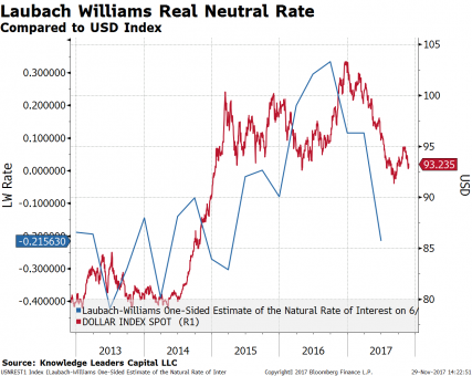 This relationship suggests the US Dollar bull run has come to a conclusion as the LW Real Neutral Rate has rolled over again. In the chart below, I focus on the last five years. Notice the US Dollar following the trend in the LW rate. The pop in the LW rate in the first quarter of 2014 led the 25% gain of the US Dollar from mid-2014 through early 2017. Notice also that the LW rate peaked in mid-2016, having fallen back by about 50bps in the last few quarters, leading the peak and decline in the US Dollar.