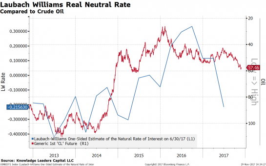 The fact that the LW rate has declined for three quarters in a row suggests this isn’t a temporary fluke. It is likely driven by the slow turnaround in oil prices. In the chart below, I plot the LW rate against oil prices. Simply, falling oil prices (red line, right scale, inverted) pull the LW rate (blue line, left axis) up. And, the reverse is true also that rising oil prices dampen the LW rate.