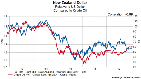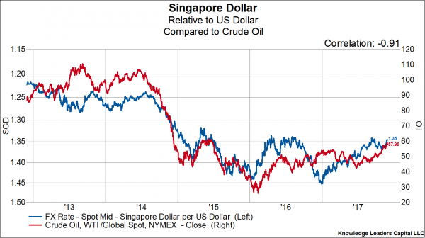 Let’s start in Asia. Among interesting developed market options for a cash allocation are the Australia Dollar, Singapore Dollar and New Zealand Dollar. In each chart below, I plot the US Dollar FX rate against oil prices, with the correlation shown in the upper right corner.