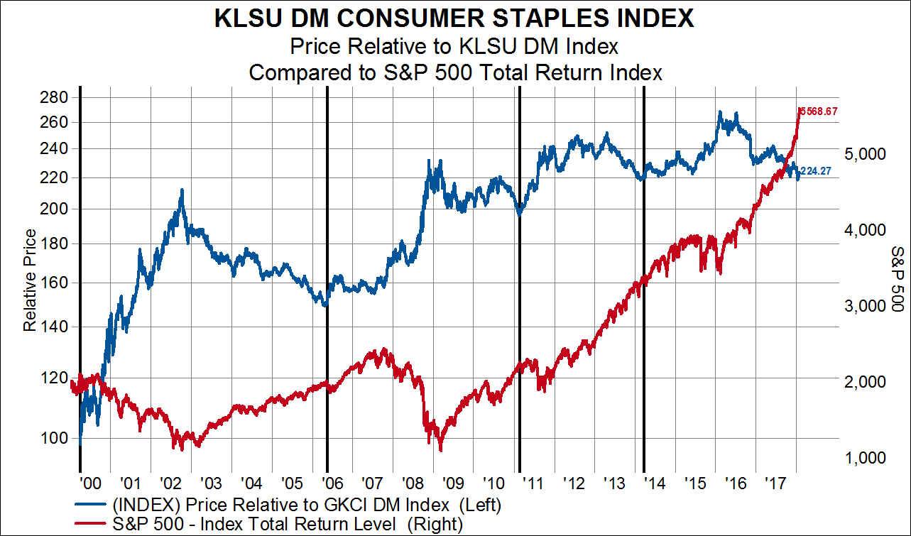 First, how is the consumer staples sector, the epitome of stability, performing relative to the overall market? An underperforming consumer staples sector is typically evidence of improving risk appetite, stable to rising interest rates and improving consumer confidence. Alternatively, outperformance of the sector can be an indication that market participants are sniffing out weakness in the economy. Usually, the consumer staples sector starts to outperform the broad market ahead of significant downturns in stocks, as the vertical lines below demonstrate. Currently, the consumer staples sector is in the throes of a multi-year period of underperformance, suggesting more strength, not weakness, is in store for the stock market.