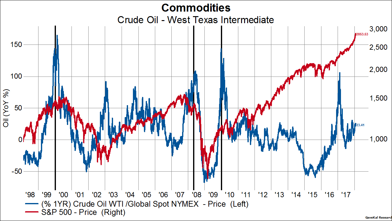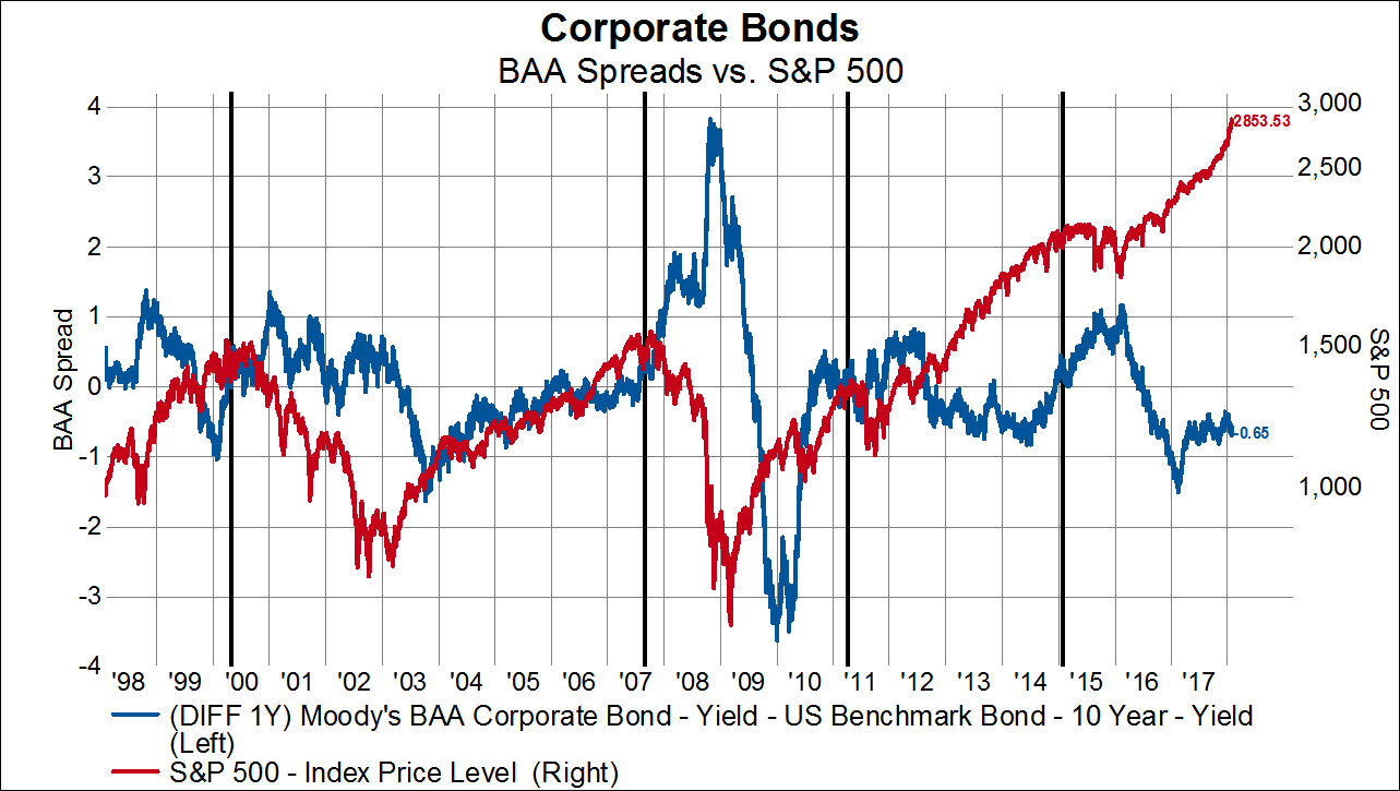 January 31, 2018With a hint of volatility returning to the stock market this week, we though it good timing to review some of the market-based indicators we follow that help us judge the sturdiness of the market. This is by no means an exhaustive list, but rather a few items to consider when evaluating whether pullbacks are for buying or selling. In each of the charts below, the indicator in question is plotted with the blue line on the left axis and the S&P 500 is plotted with the red line on the right axis. Vertical reference lines have been added to highlight important turning points for each indicator.