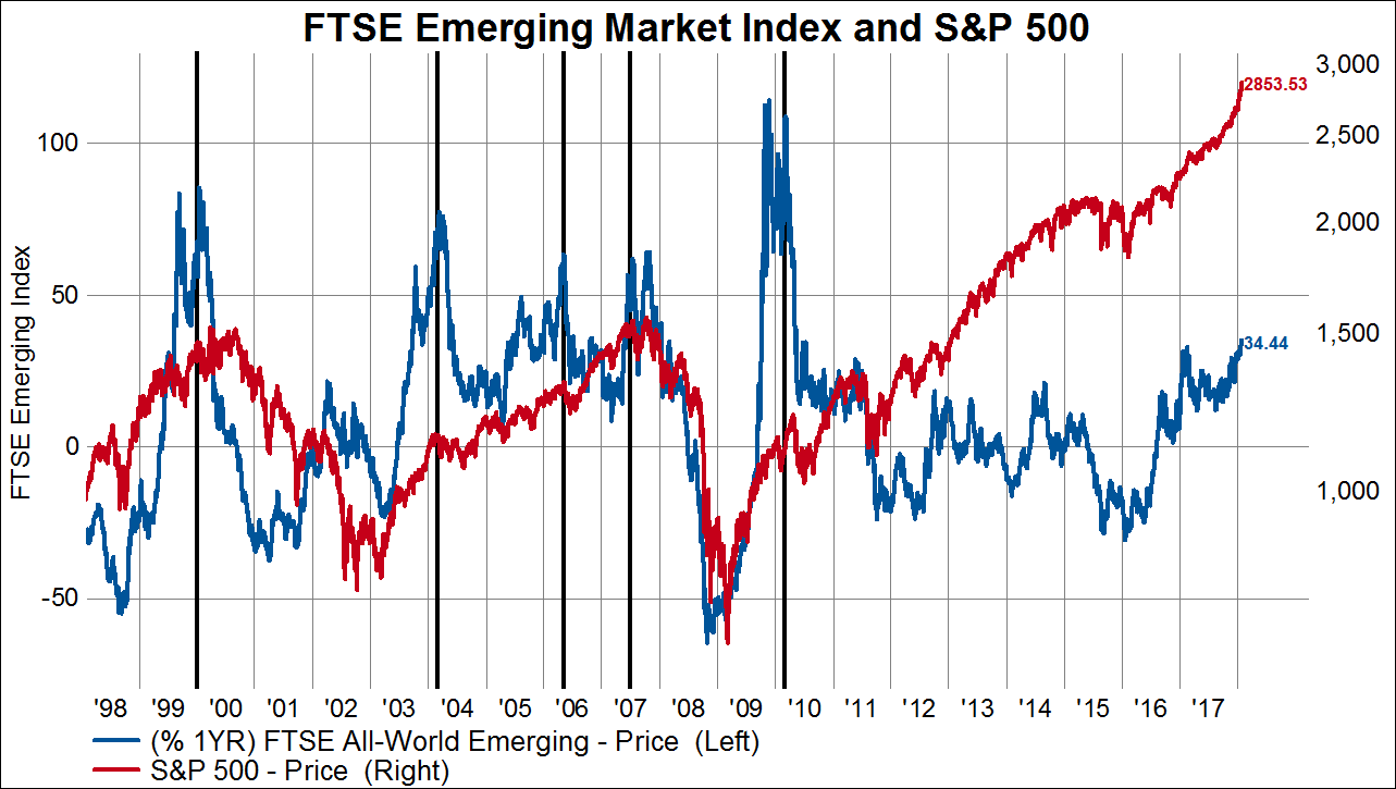 Finally, a good gauge of excessive investor sentiment, and therefore higher than normal market risk, is the year-over-year performance of emerging market stocks. When EM stocks are up more than 50% on a year-over-year basis it suggests investors have submitted to a fully risk-on, pedal to the metal mentality. Such euphoria is never sustained for long and so parabolic price spikes in EM stocks tend to lead market selloffs. EM stocks, while some of the best performers over the last year, haven’t quite reached fever pitch yet.