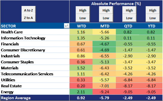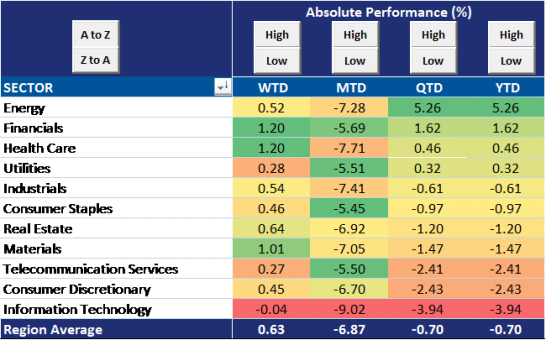 February 13, 2018Year-to-date the energy sector is the worst performing sector in the developed markets. In the tables below, I highlight statistics from our Knowledge Leaders Selection Universe (KLSU) which captures the top 85% of market cap in the developed and emerging markets. The KLSU DM Energy sector is down 9.05% YTD, making it the worst performing sector in the developed world. Breadth has been fairly negative over the last 200 days, with only 43% of energy companies above the moving average. While the defensive utility, telecom and real estate sectors have the worst breadth in the developed markets YTD, energy is the weakest cyclical sector.