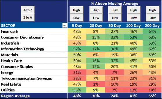 Interestingly, the KLSU EM Energy sector is not only the best performing sector in the emerging markets, it is also the best performing region/sector in the combined all country world. Its lead is rather significant, outpacing the next closest sector by over 4.5%. It is also the sector with the best breadth in either the developed or emerging markets, with 79% of EM energy stocks above the 200-day moving average.