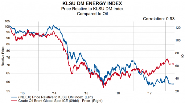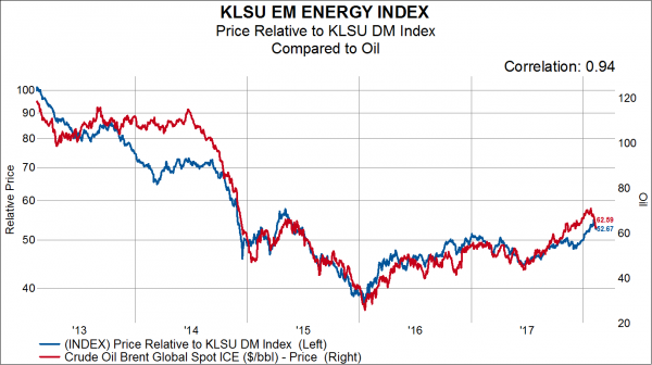 This bifurcation is difficult to explain given that the relative performance of both the DM and EM energy sector is highly correlated to oil prices. The KLSU DM Energy sector’s relative performance is 93% correlated with oil prices. After a good relative performance year in 2016, the DM energy sector retreated in 2017 and is now testing relative performance lows again. A successful test of lows should be interpreted as a bullish signal.