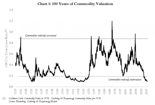 It is important to remember the big picture here. Commodity prices are as cheap relative to stock prices as they have ever been. In the chart below, I show the relative performance of the GSCI Commodity Index relative to the Dow Jones Industrial Average for the trailing 100 years. Commodities have historically made three major lows relative to stocks and appear to be making the fourth. The first low was at the peak of the Roaring Twenties stock market boom in 1929 where auto and radio stocks soared. The second low was in the early 1970s after Nixon severed the US Dollar link to gold when the Nifty-Fifty stocks were the rage. The third low was at the peak of the internet bubble in the late 1990s. Each of these periods were preceded by a decade (1920s, 1960s and 1990s) of huge credit expansion that boosted equity prices to unsustainable levels.