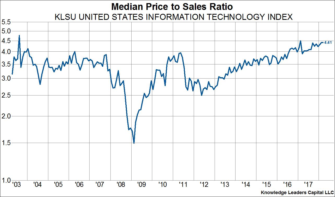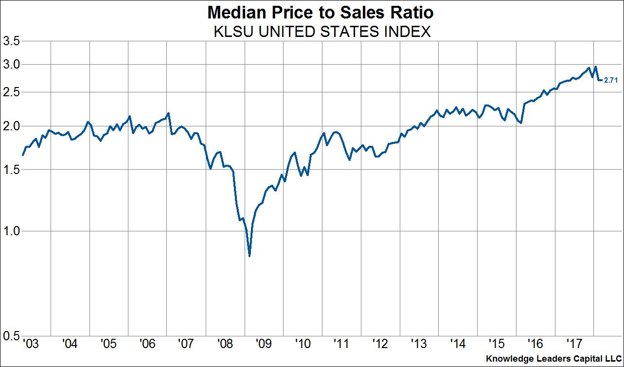 Last but not least, let’s not forget about valuations. The median tech company’s price to sales ratio remains at its highest level outside of the tech bubble. The same can be said for the median price to sales ratio for all stocks.