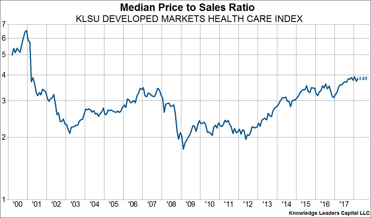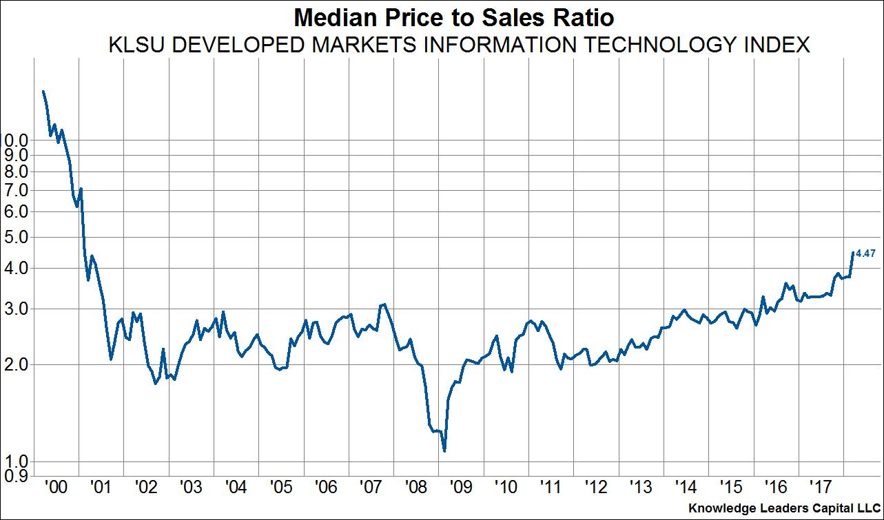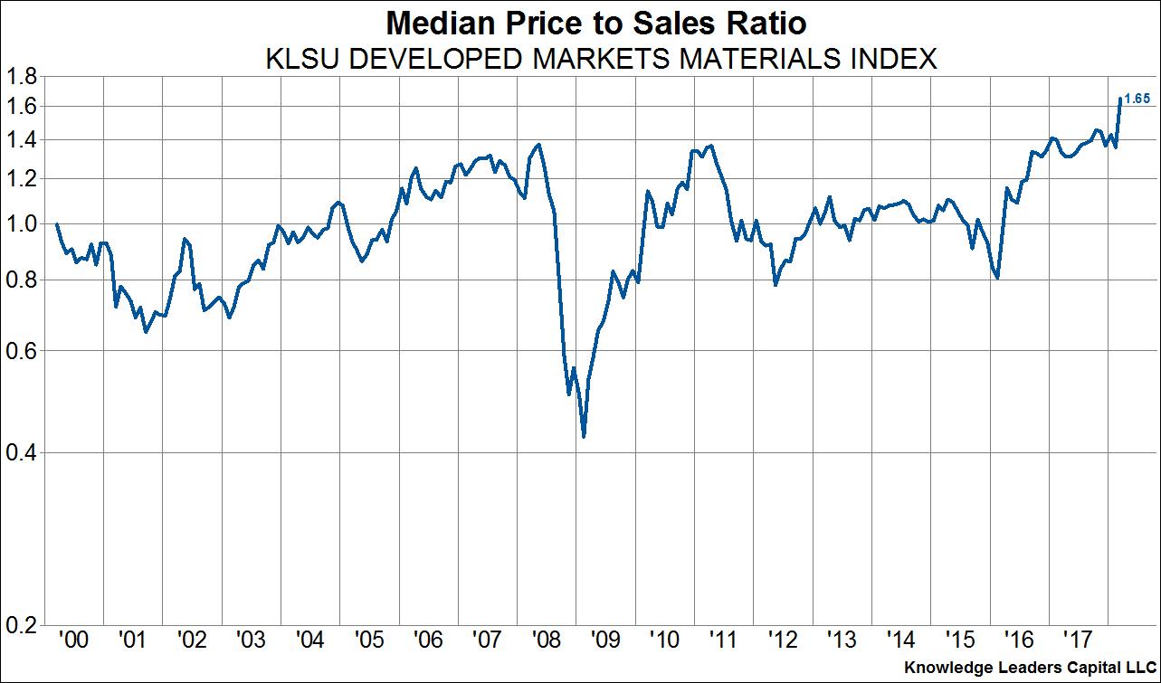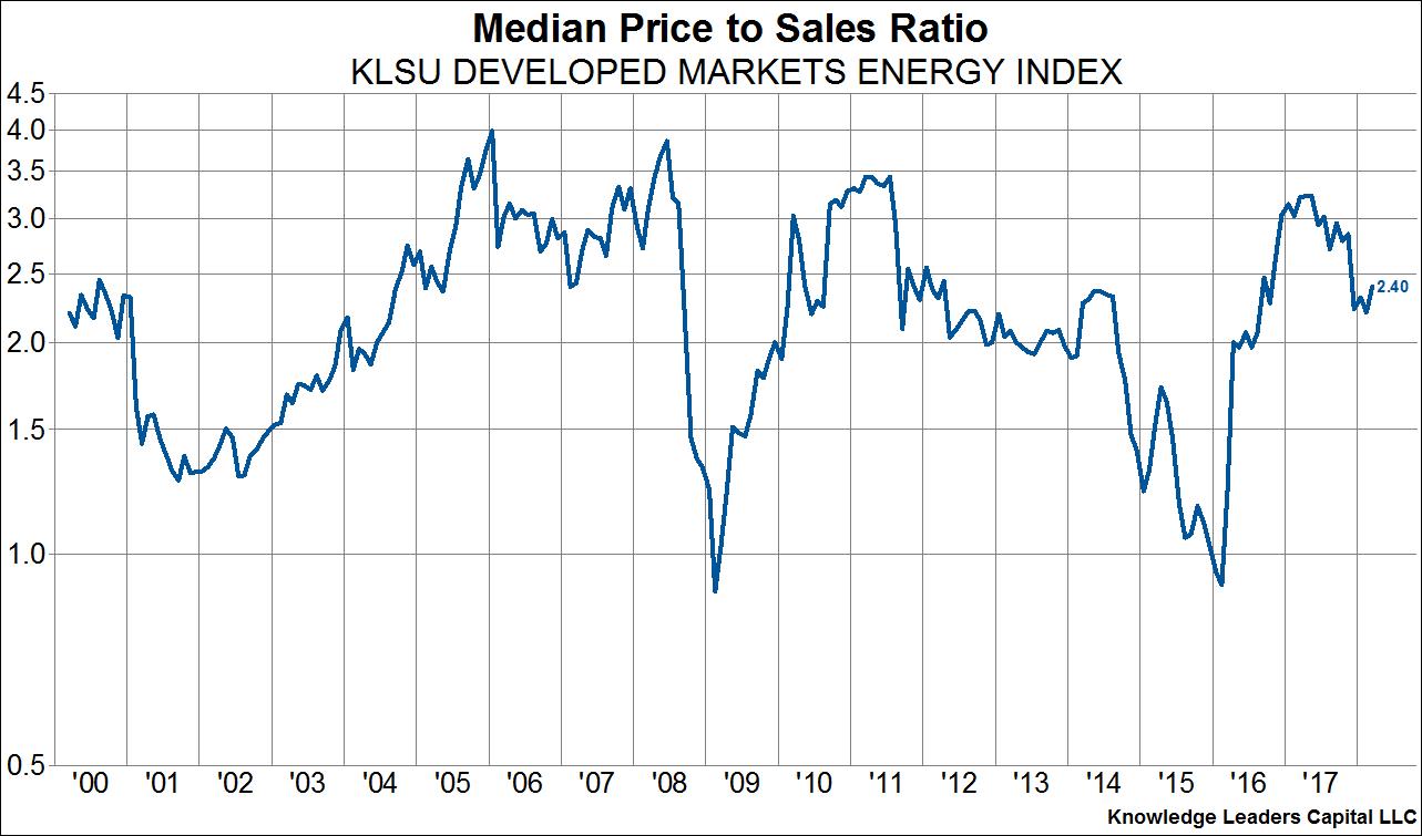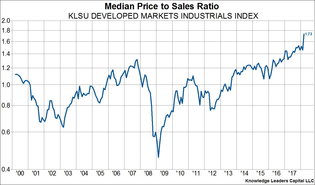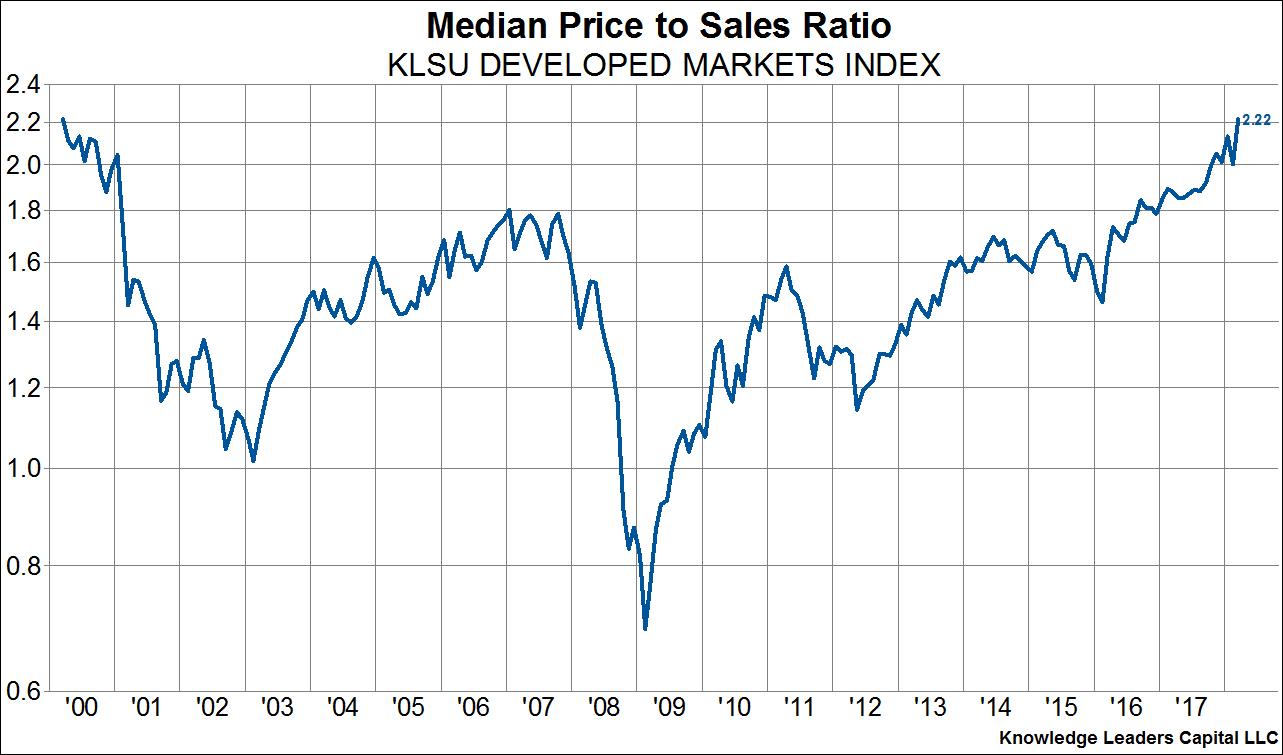 Another month and another new high in equity valuations, at least relative to sales. Indeed, the median company in our developed world index (which covers the top 85% of companies in each country) just achieved a price to sales ratio that eclipsed the 2000 peak. There are of course fundamental reasons for this ranging from low interest rates to high profit margins, but the fact that valuations today exceed peak bubble valuations of 2000 is a tough nut to swallow for equity investors expecting to achieve an historically average 7% annual rate of return. What’s more, unlike in 2000 when the median valuation was driven higher primarily by tech stocks, leaving plenty of “value” areas to flock to, valuations today are extended across the board, from staples, to industrials to tech to materials. Save energy as the one sector without peak, or near peak valuations. This scenario should put ever more importance on stock picking and risk management going forward.