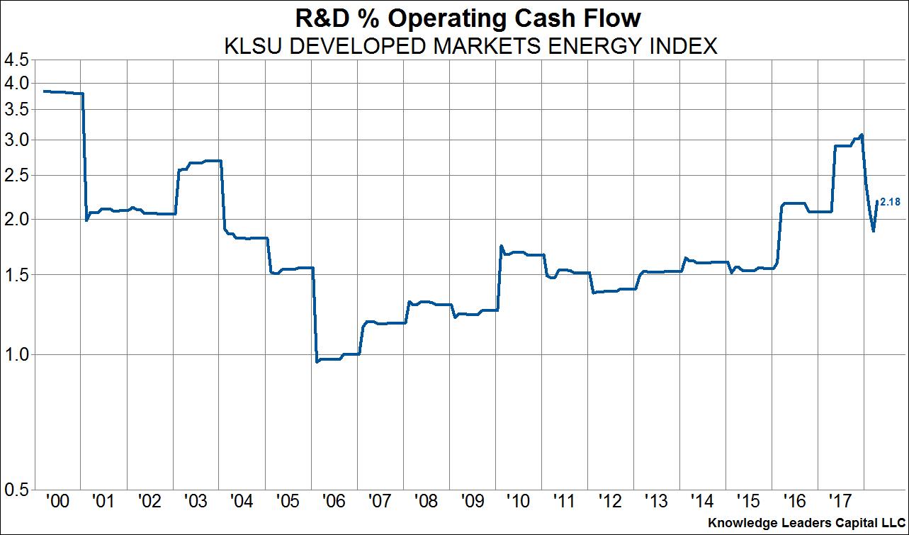 Energy stock fundamentals remain appealing. Global developed market energy stocks are still trading at recessionary valuation levels with the median dividend yield of 2.5% being near the highest recorded over the last two decades. CapEx as a percent of sales has fallen from 15% to 10% (which will act as a limiter to supply over the coming years), which has pushed up free cash flow to the highest level since 2007. Meanwhile, R&D investment - which we view as a higher return investing endeavor - continues to march higher.
