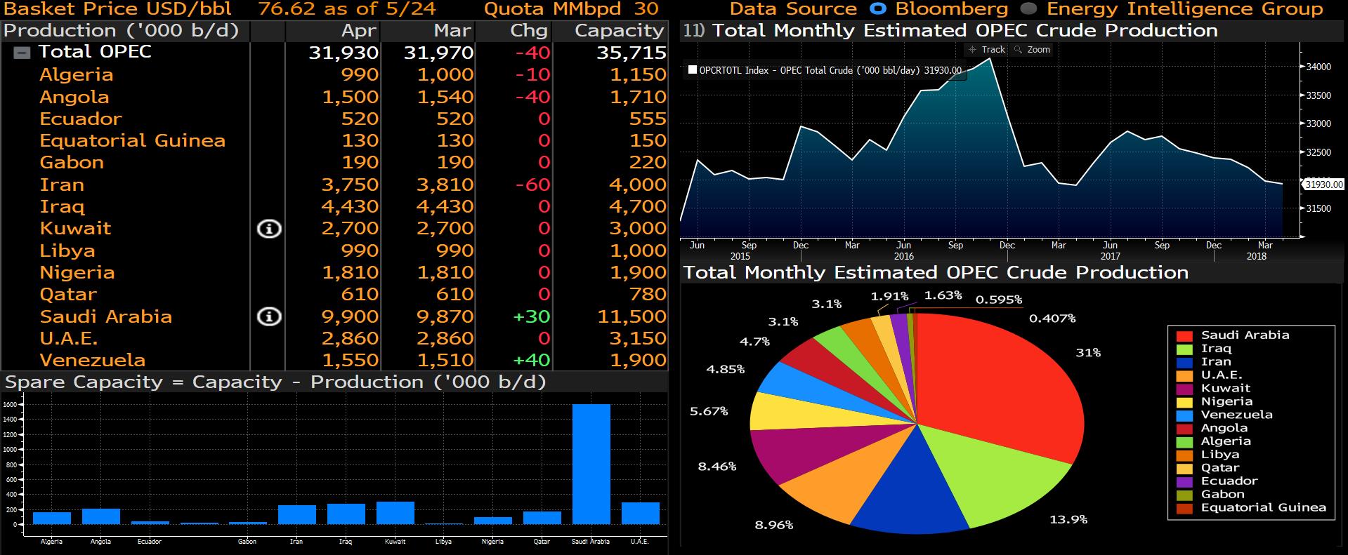 Next onto production. US crude oil production is growing at a breakneck speed, with some estimates putting total US production at 12m barrels/day by 2020. But, OPEC production (displayed in the Bloomberg screenshot below) is falling and despite the remarks today, the risk is to the downside. Venezuelan and Iranian production in particular is at risk of a major drop on political disarray and sanctions. And, just last month Saudi Arabia was on record saying it wanted $80 oil to support the Aramco IPO.