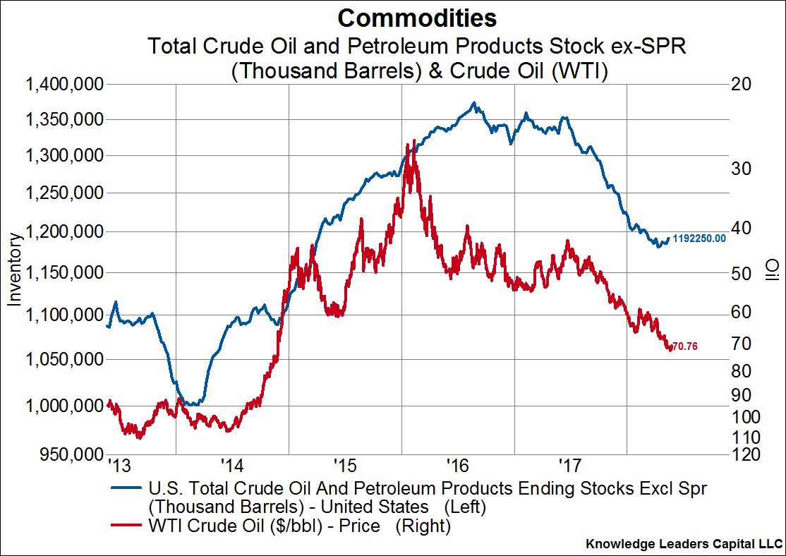 Next to inventories. US inventories this week registered a build of 5.8m barrels when the market was expecting a draw of 1.6m barrels. This helped push oil prices down this week, but the trend in inventories is clearly down. As the next chart below shows, inventories have been falling since the second half of 2016, and oil prices follow the trend in inventories closely.