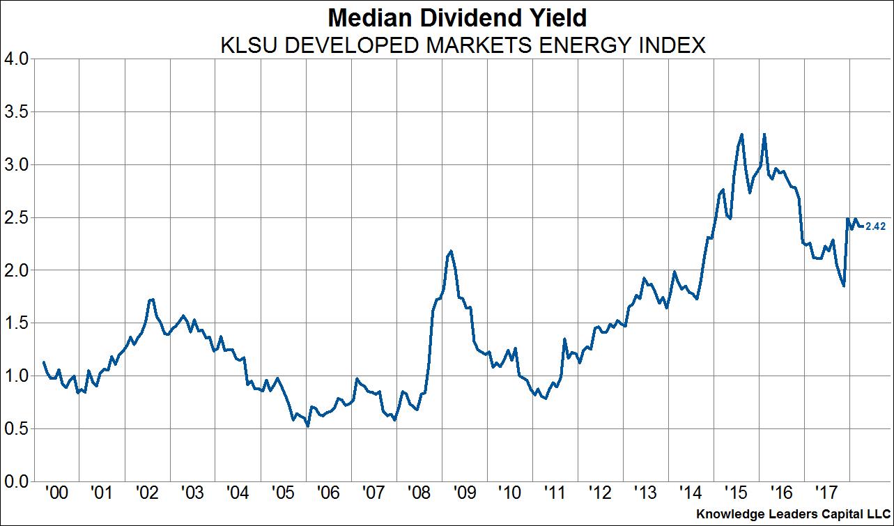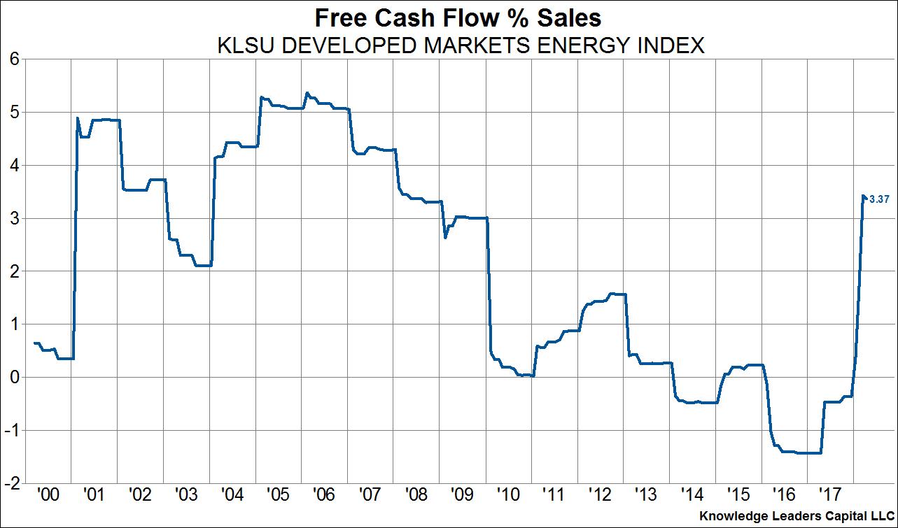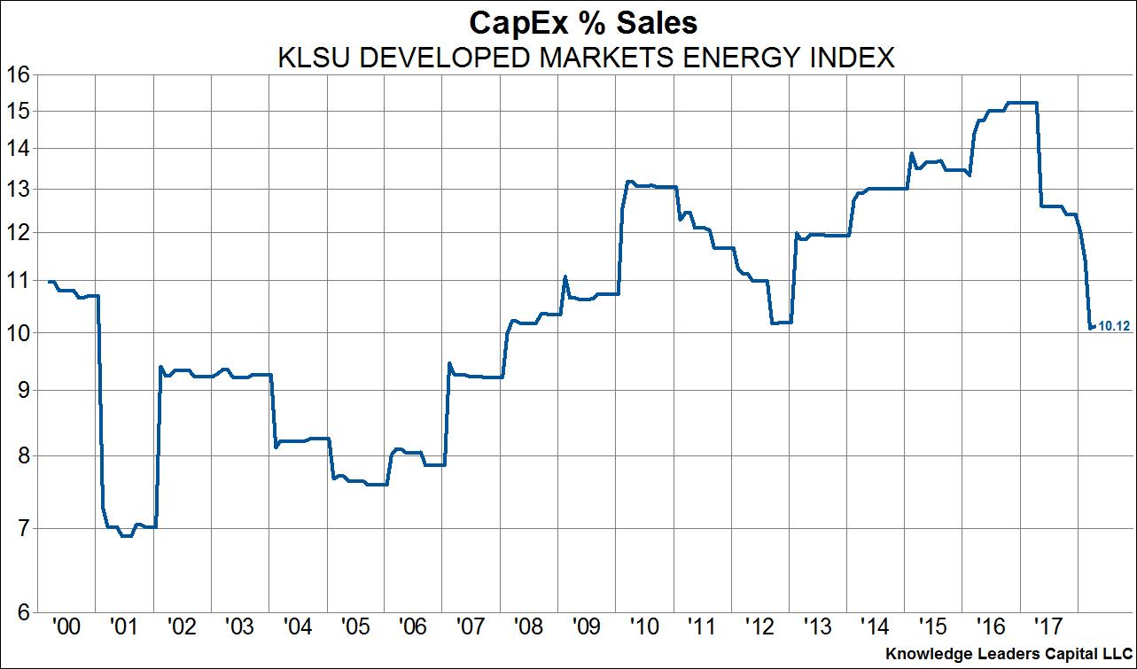 First off, it’s useful to review were we’ve come from in the energy complex. Not that long ago, energy commodities and energy stocks were absolutely hated. Indeed, the energy sector is the worst performing developed market equity sector over the last four years, down 22%. The energy sector finished 2017 with its lowest weighting in the S&P 500 ever. But, over the last three months, energy is the best performing global sector, even after taking into account this week’s selloff. Momentum is turning for energy.