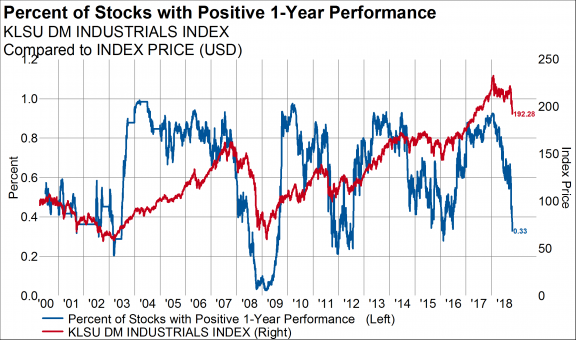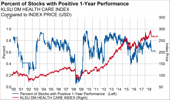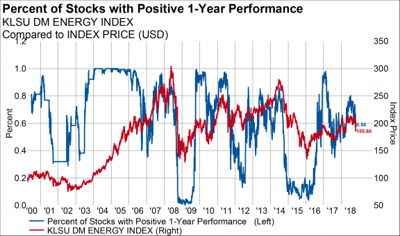 Next, if we look at the percent of companies with positive performance over one year, energy displays positive breadth characteristics.
