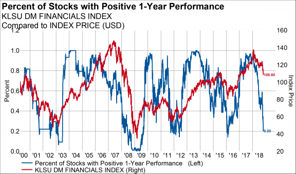 One of the hardest hit sectors globally is the financial sector, with only 20% of stocks with positive performance over the last year.