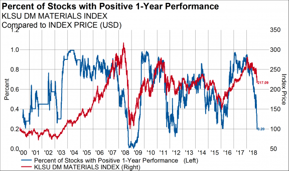 Similar to financials, 80% of materials companies had negative 1-year performance.