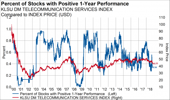 Thirty-four percent of telecommunications companies had positive 1-year performance.
