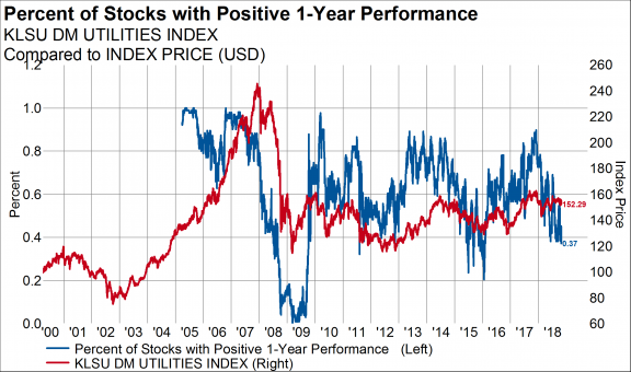 Thirty-seven percent of global utilities had positive 1-year performance.