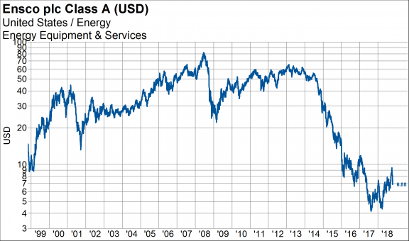 An energy company like Ensco could be on the opposite end of the risk spectrum. We already have experienced the 90% decline/bear market/bust cycle. This recent minor decline was after a massive secular decline. From 2015, Ensco is down 90%.