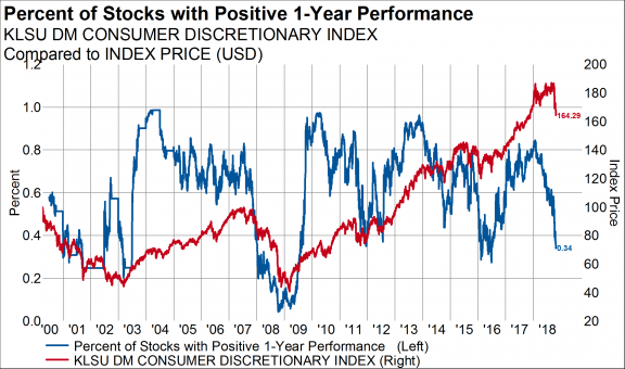 Thirty-four percent of Developed consumer discretionary companies have positive returns over the last year.