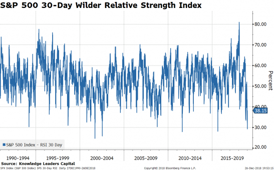 December 28, 2018The S&P 500 experienced a waterfall decline in December, something rarely seen. Measuring the decline using a 30-day Wilder Relative Strength Index, it is clear the extremes recently experienced. On Christmas Eve, the S&P 500 punctured 30% on the RSI, something that has only happened several times in since 1990. Similar extreme readings were seen at important intermediate lows (2001-2002, 2008, 2011 and 2015).