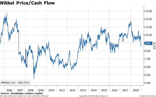 As described earlier, the S&P 500 has seen its price/cash flow ratio fall from 14x to 11x this year as stocks corrected. The Nikkei 225 has seen its price/cash flow multiple compress from just under 12x earlier this year to just under 9x currently. So, the Nikkei’s price/cash flow multiple is about 20% cheaper than the S&P 500. Due to the more extreme oversold readings and cheaper valuations, we have a preference for Japanese shares over US.
