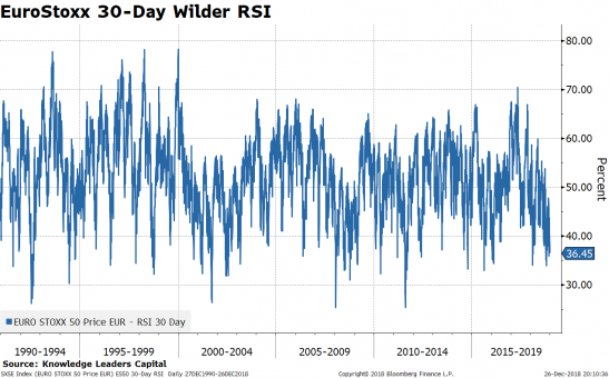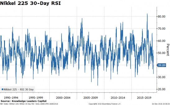Foreign stocks have recently experienced similar waterfall declines and have generated significant oversold conditions as well. The Nikkei 225 Index didn’t quite reach the 30% threshold on the Wilder RSI, but it came close, hitting 33% on Christmas Eve.
