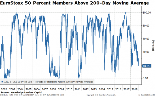 Across the pond, European stocks have generated a set of oversold readings as well. The EuroStoxx 50 Index touched 35% recently, on par with extreme readings seen in the last several decades.