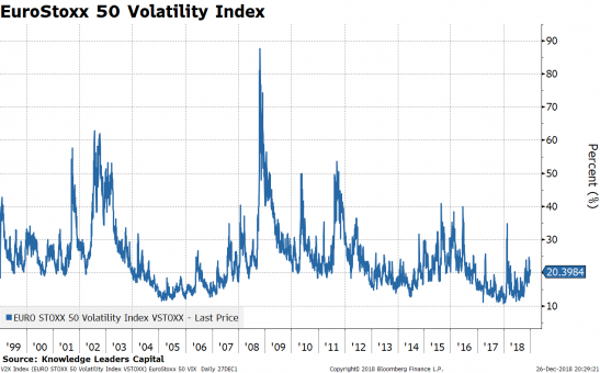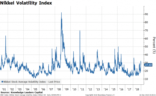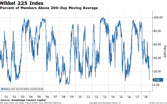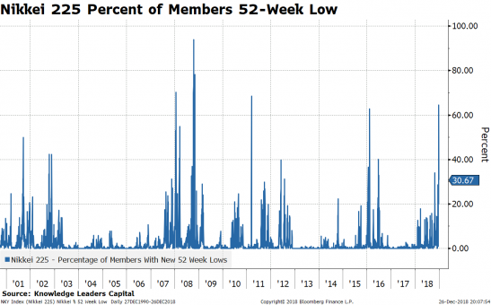 While the Nikkei 225 didn’t generate as low an RSI reading as the S&P 500 recently, it has exhibited other oversold characteristics more extreme than the S&P 500. On Christmas Eve, the Nikkei 225 saw 63% of its members reach new 52-week lows, about 10% more than the S&P 500. Here again, current readings challenge the most extreme oversold readings seen in the last couple decades. The percent of Nikkei 225 members at new 52-week lows eclipsed 60% only four times since 2000 (2008-2009, 2011 and 2015).