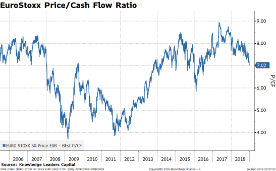The EuroStoxx 50 has seen its price/cash flow ratio fall from just under 9x earlier in the year to about 7x currently. While this is not as a large a compression as the S&P 500 experienced, the level is about 30% cheaper than the S&P 500.