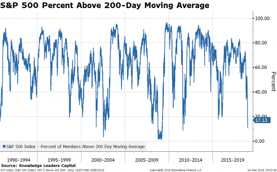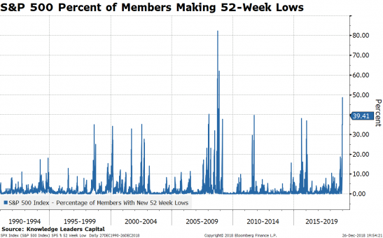 Measuring the percent of stocks making new 52-week lows is another tool we employ to measure oversold extremes in stocks. On Christmas Eve, over 49% of S&P 500 stocks were making new 52-week lows, a figure only eclipsed by the period immediately following the failure of Lehman Brothers in the autumn of 2008.