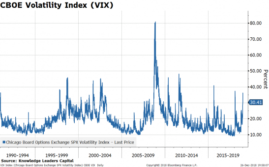 An additional piece of the puzzle when identifying oversold conditions is extreme readings in volatility. Generally, when investors panic, they pay up for insurance on further declines. Imagine if one had the prescience to know when one was going to get into a car wreck. One would increase coverage, paying a higher premium, in anticipation of the crash. Insuring stock portfolios works somewhat the same way. As momentum gets rolling on the downside, signaling an increasing probability of a crash, investors that buy insurance to manage risk, pay up for downside protection. The VIX measures this scramble to buy insurance at ever higher prices. On Christmas Eve the VIX eclipsed 35%, a historically elevated level. VIX spikes above 35 were seen at important equity lows in 1990, 1998, 2001-2002, 2008, 2010, 2011, 2015 and 2018.