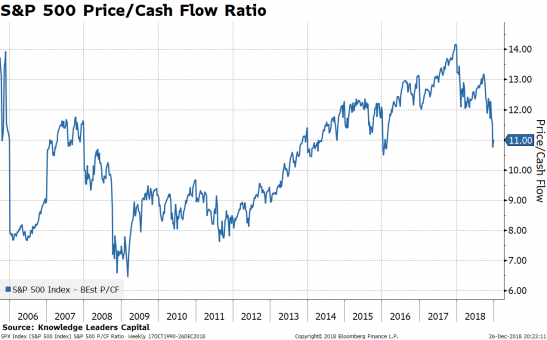 Generally, market corrections produce cheaper valuations, which offer an investor a chance to buy into discounted assets thereby improving his or her future returns. While current valuations are clearly not as low as the once-in-a-generation lows we experienced in 2008-2009, they are 30% lower than the start of the year. The 30% drop in the S&P 500’s price/cash flow ratio is larger than anything experienced since the start of the current bull market which started March 9, 2009. The S&P 500 price/cash flow ratio is back to where it was at the end of 2013.