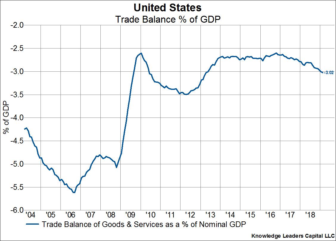 March 06, 2019The big news of the day relates to the continuation of a trend that has been going on since 2013: the widening of the trade deficit. The trade deficit in dollar terms at $-59.8bn in December and $-622bn for the year broke down to a new 10-year low. The trade balance as a percent of GDP at -3% broke down to a level not seen since 2013. Yes, these are big numbers, but they are entirely reflective of the economic policies pursued in this country and really shouldn’t come as much of a surprise. More important for our readers than that though, is the question of what this all means from an investment perspective. In this note we’ll cover both the why and what it means for financial markets.