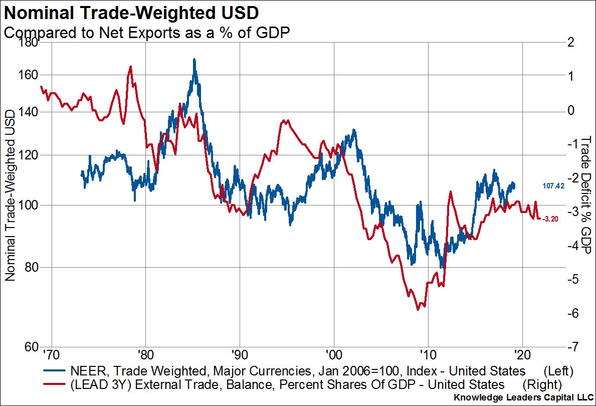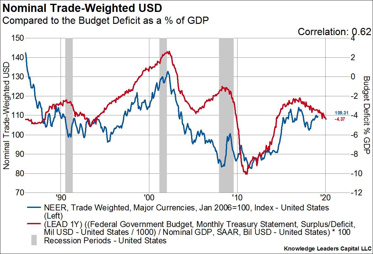 The dollar can rise and fall based on relative levels of inflation, growth, liquidity, or capital flows. It’s value is certainly more complicated than extrapolating changes in the budget and trade balance. Nonetheless, when trade and budget deficits are wide and widening, foreign investors require a dollar discount in order to finance the deficits. This is especially true if relative interest rate levels fail for whatever reason to compensate foreign investors for their risk. And so the dollar falls, thereby increasing the future ROIC on US dollar assets. We can see pretty clearly in the next two charts that both the budget deficit and trade deficit lead the value of the dollar by between 1-3 years. Both the budget and trade deficits are pointing to a lower dollar in the years ahead.