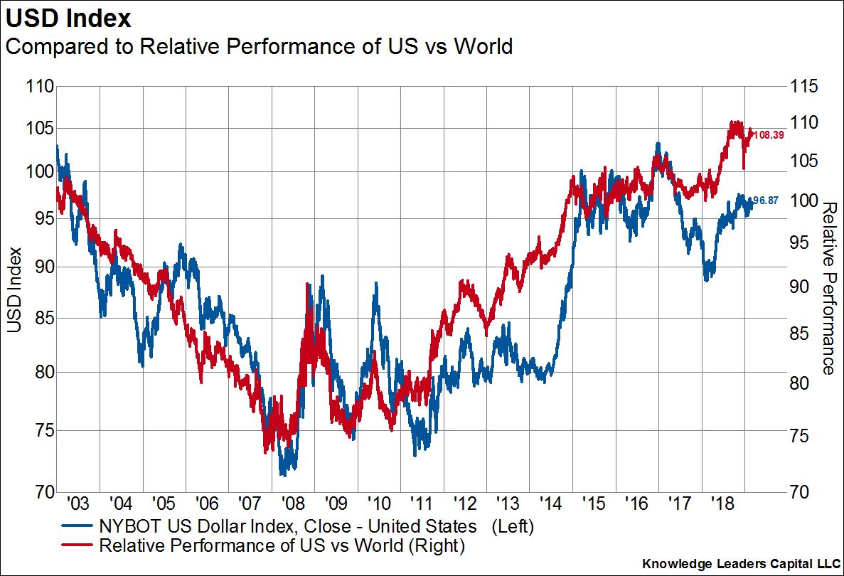 Moving on to stocks, the relative performance of foreign equities in US dollar terms is closely tied to the direction of the dollar, since a large portion of those returns are from the currency component. As we can see in the next chart, so goes the dollar, so goes the relative performance of US stocks vs foreign stocks.