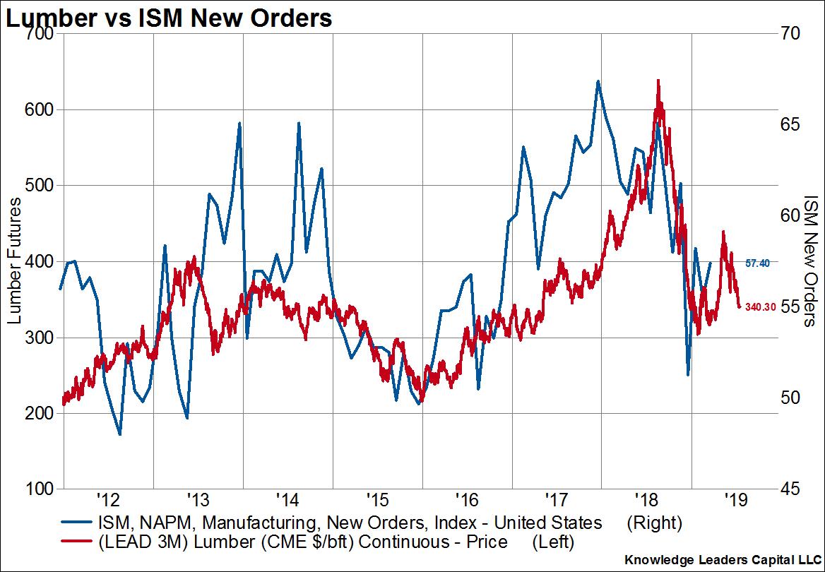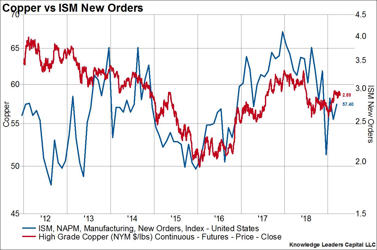 In the second and third charts below I plot the lumber and copper prices, respectively, against the ISM new manufacturing orders series. ISM new manufacturing orders are regarded as one of the best and most consistent indicators of economic activity over the next quarter or so. Lumber prices lead the ISM new manufacturing orders series by three months while copper prices act coincidentally.