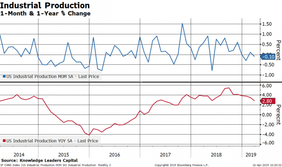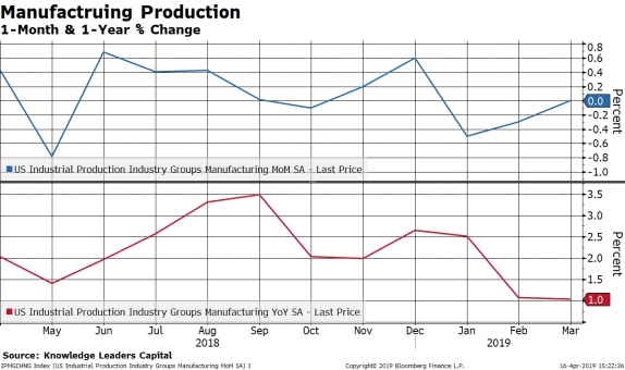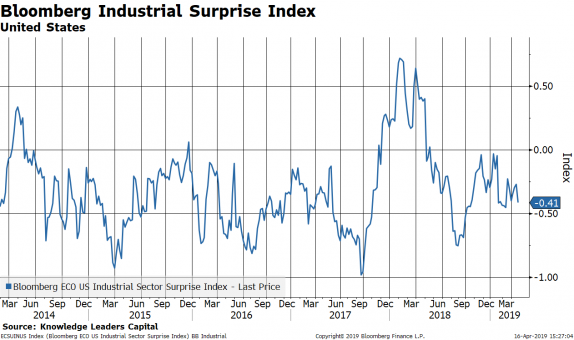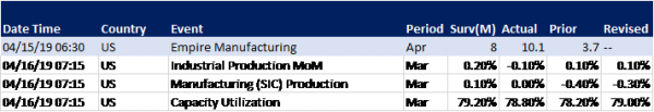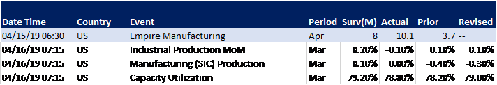 April 16, 2019So far this week, we’ve received a few data points that reinforce the manufacturing slowdown taking place in the US. Below is a calendar of events for the last couple days.