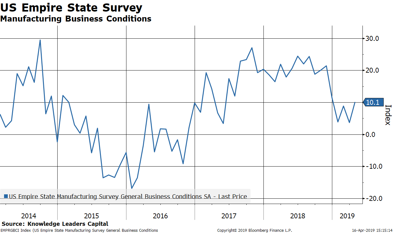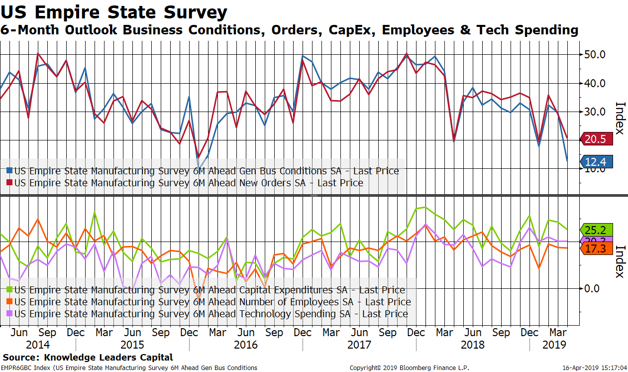On Monday, we got the Empire State Survey, a survey of manufacturing in New York. Importantly, this is one of the few “soft” data points we have for April, so its message is important. It turned up slightly from last month, showing some stabilization and beating estimates, but it is still well down from 2018 levels.