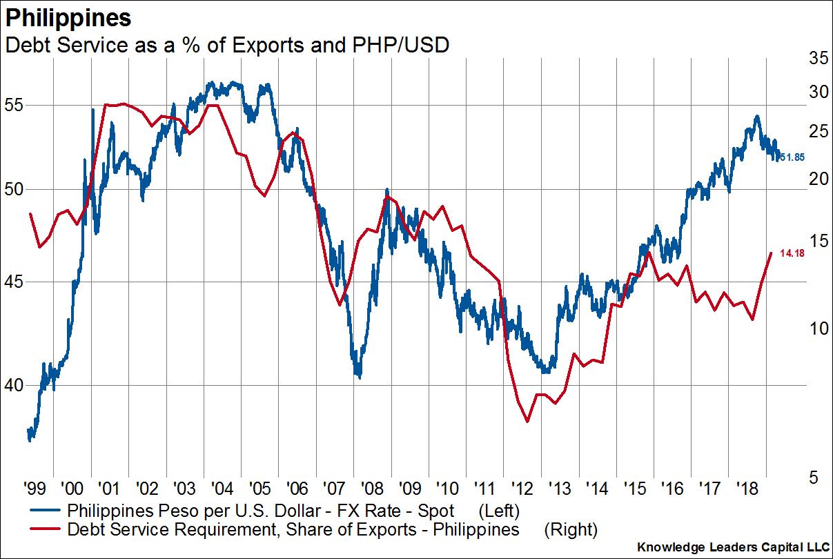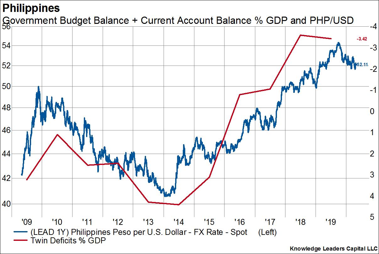 Here we show the twin deficit as a percent of GDP (right axis, inverted) overlaid on the Philippine peso per USD exchange rate (left axis). The exchange rate leads by one year. As the currency rises (blue line going down), the twin deficits improve materially, as they did from 2009-2014. When the currency falls the twin deficits deteriorate as USD debt payments become more onerous.