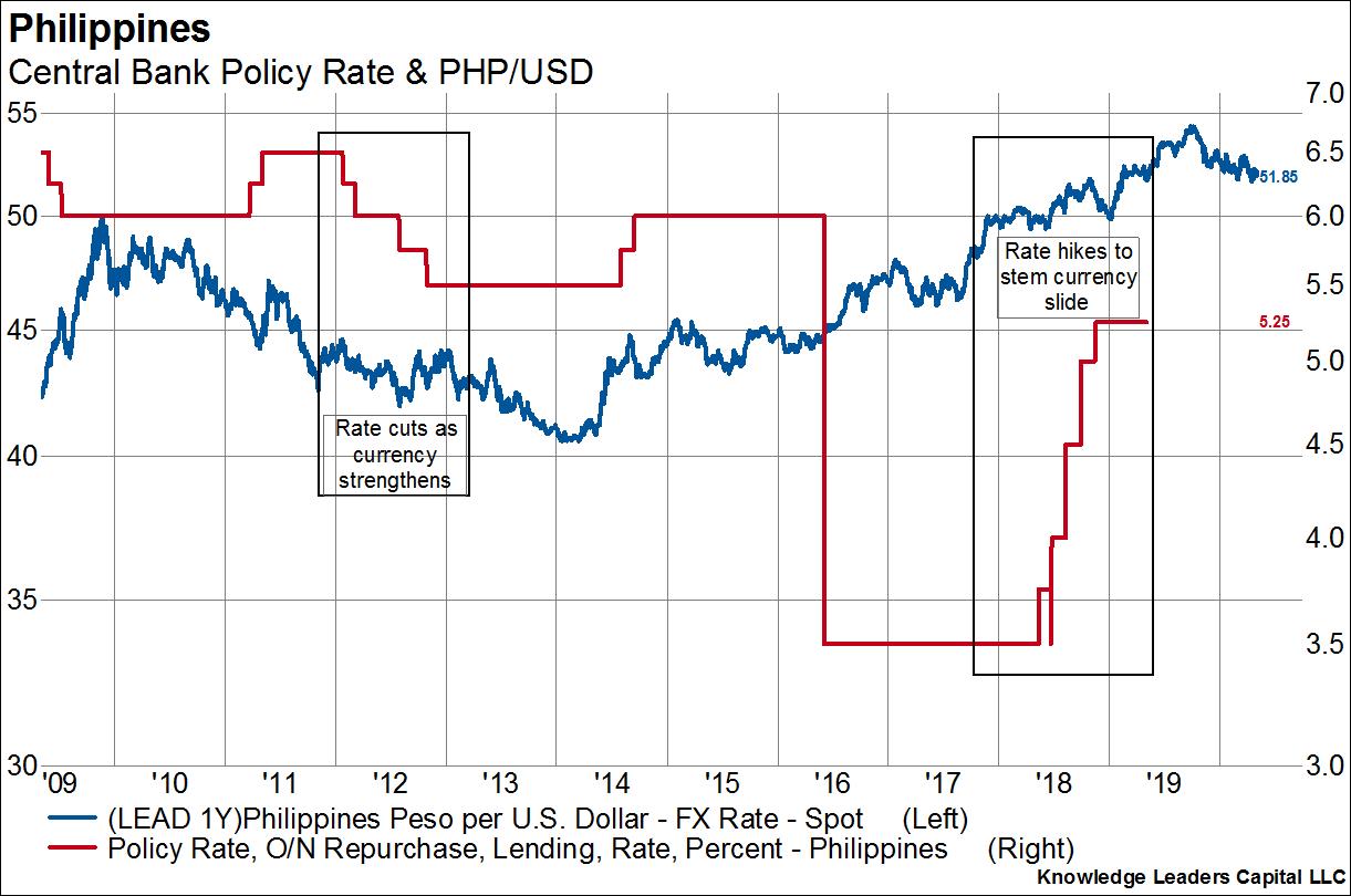 The inflationary dynamics cause the central bank to act. In the case of the Philippines, this meant rate cuts from 2011-2012 as the currency was strengthening and rate hikes in 2018 as the currency was falling precipitously. In this case, currency moves led central bank action by about a year.