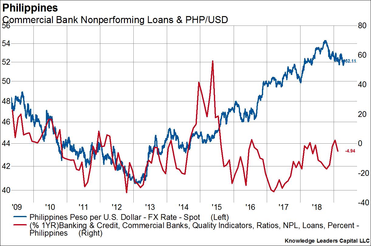 Non-performing loans are highly correlated to changes in the exchange rate. A rising local currency means debt payments are easier to meet and NPLs fall. A falling currency means debt payments are much more difficult to meet and NPLs rise.
